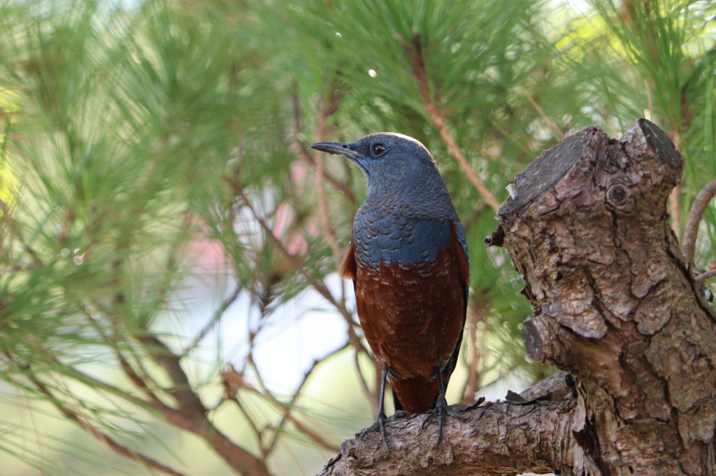 海岸のクロマツにとまるイソヒヨドリ。磯でフナムシをとらえたり、里地で畑のバッタ類を狩ったりしている。初夏によく街中の小高い建物の上などにとまり、よく響く声で高らかにさえずっている。