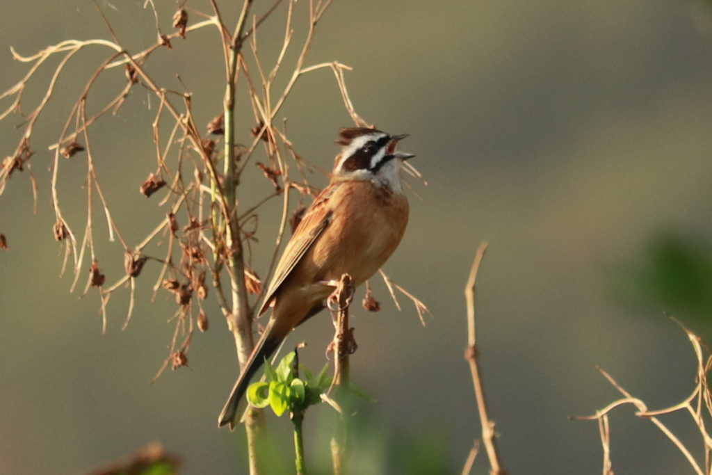 里地の畑まわりで高らかにさえずるホオジロ。はっきりしているわりに言葉にしにくいフレーズで、様々な人がこれを聞きなそうと試みているが、鳴き方のバラエティが豊かなこともありなかなか納得のゆくものがない。この個体のさえずりは「ちょっちょスイーツto be?」