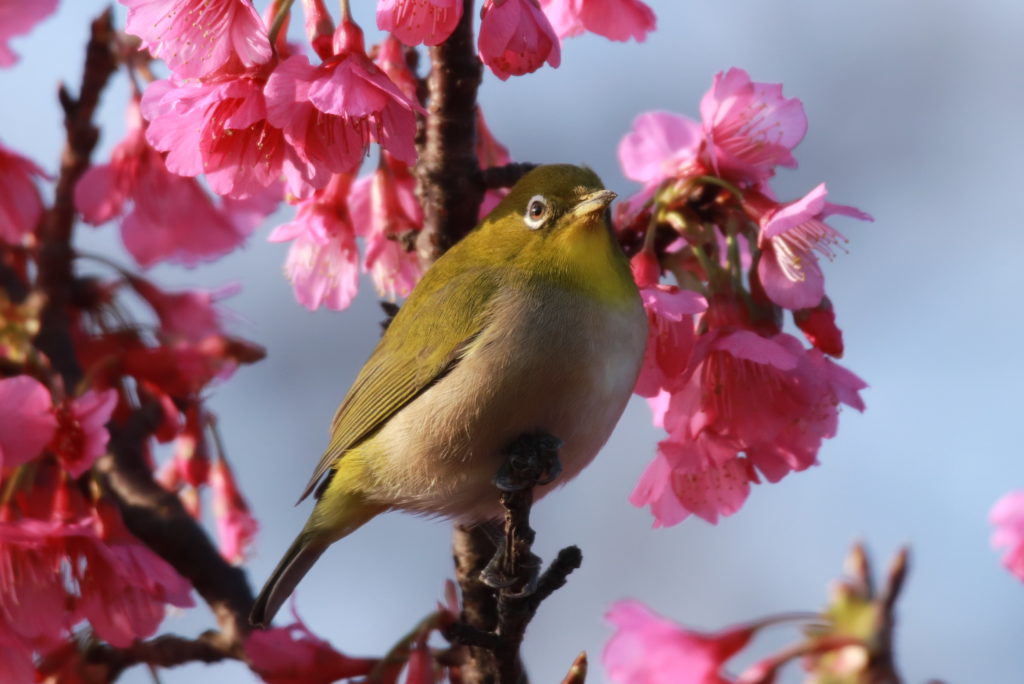 屋久島にはスズメよりメジロが多いとよく言われる。冬から春にかけて里地のツバキやカンヒザクラなどの花の蜜を求めて、群れでにぎやかに駆け回っている。ツバキの花はメジロ用に作られたのではないかと思うほどサイズもデザインもぴったりで、観察していると花びらに小鳥の爪の跡がたくさん残っていることがある。