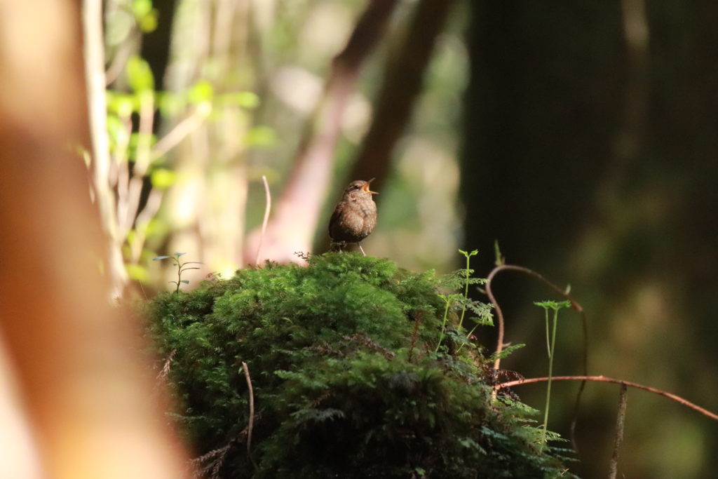 里地に多いヤブサメに対し、コケの生すような深山の幽谷に多いのがミソサザイ。3月の春の雨の降りだしと主に元気いっぱいさえずり始めるが、そのフレーズは高らかに複雑に果てしなく続くため、聞きなしは困難だ。オスがメスを迎えるためにこしらえる巣には様々なコケが構造やクッションに使われており、たまに登山道などでも見ることがある。和名は「三十三歳」からきているようで、江戸時代の川柳にしばしば登場する。